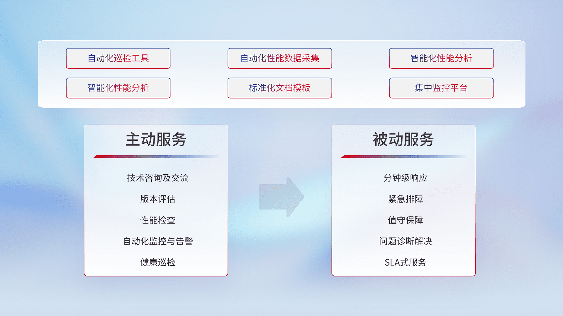 智能化工具和标准化文档,,,,保障服务质量,,提供主动服务(包含技术咨询、、、、版本评估、、性能检查、、、、自动化监控与告警、、、、健康巡检)和被动服务包含(分钟级响应、、、、紧急排障、、、、值守保障、、、、问题诊断解决、、、、SLA服务)。。。。
